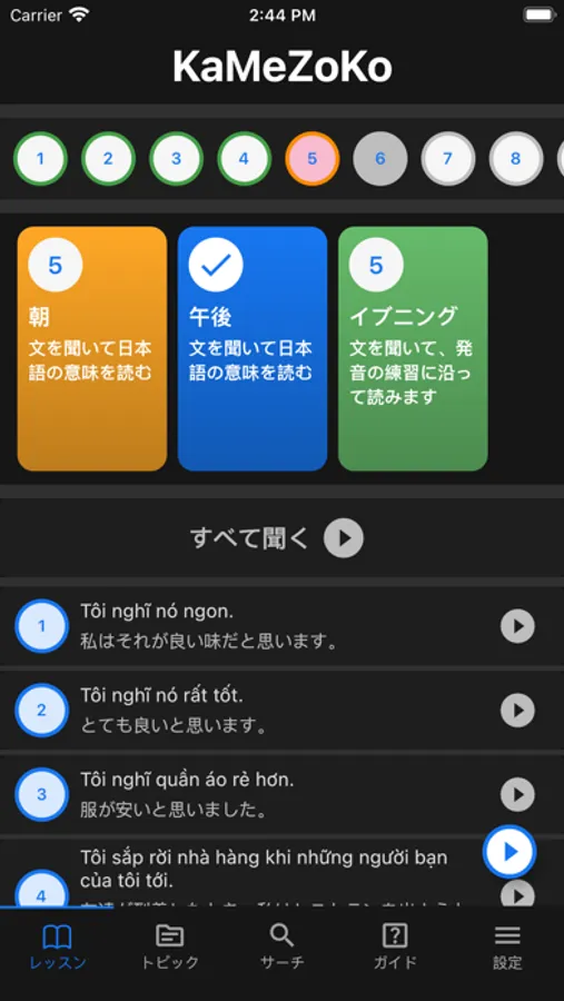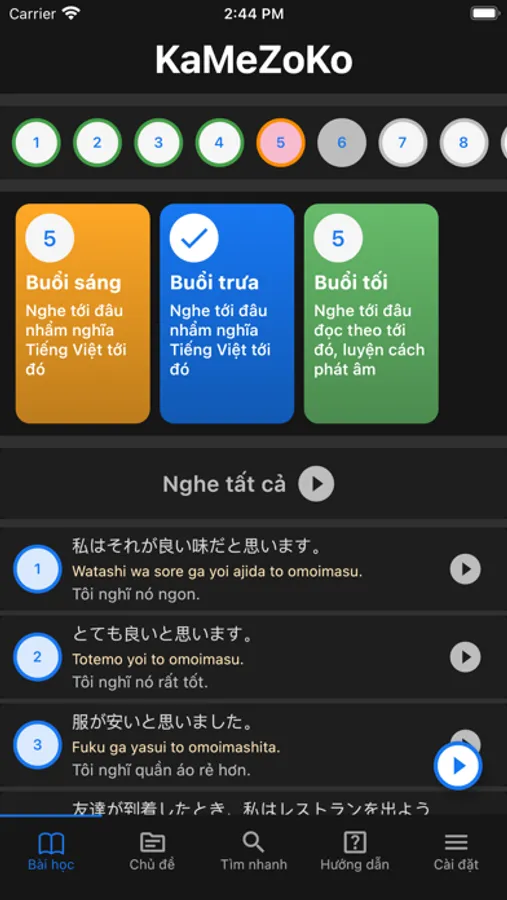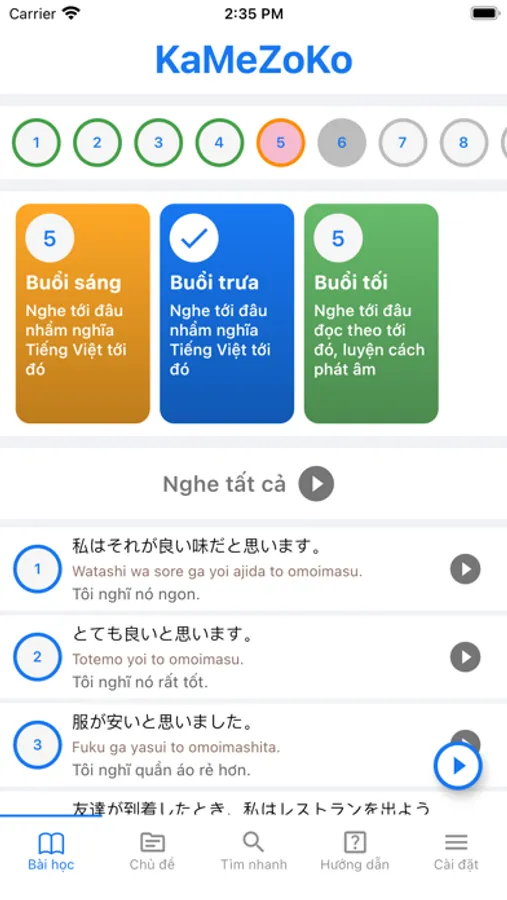 - Cứ 5 ngày, chúng ta bỏ ra 1 ngày để ôn lại 5 ngày học trước đó. Mỗi câu lặp lại 2 lần. Tương ứng với các ngày được tô màu sám trong ứng dụng KaMeZoKo.