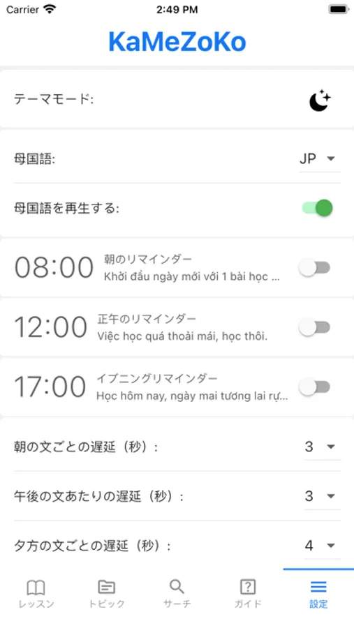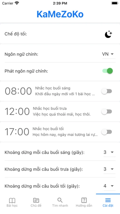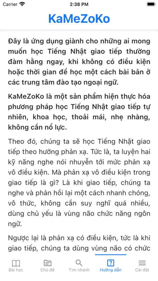 KaMeZoKo là ứng dụng miễn phí, mong muốn giúp mọi người có thể học Tiếng Nhật giao tiếp một cách thoải mái hơn, phản xạ hơn và ngày càng thành công trong cuộc sống. Chúc vui vẻ.