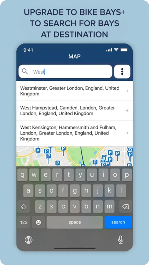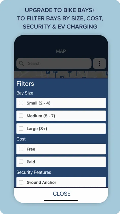 Bike Bays+ also adds a search bar to find bays near your destination, as well as a filter to show bays that meet your search criteria.