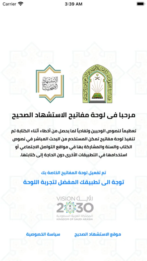 تعظيماً لنصوص الوحيين وتفادياً لما يحصل من أخطاء أثناء الكتابة تم تنفيذ لوحة مفاتيح تمكن المستخدم من البحث المباشر في نصوص الكتاب والسنة والمشاركة بها في مواقع التواصل الاجتماعي أو استخدامها في التطبيقات الأخرى دون الحاجة إلى كتابتها.