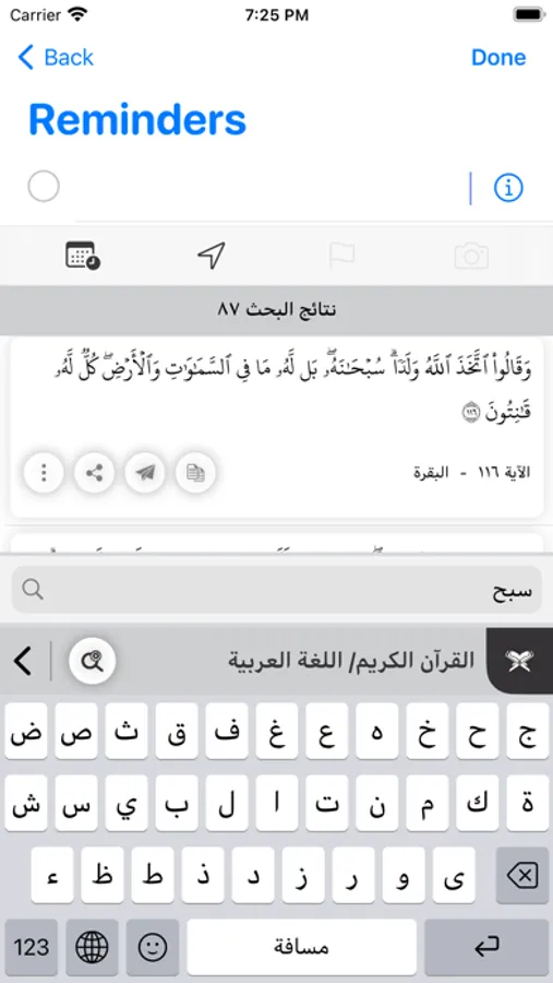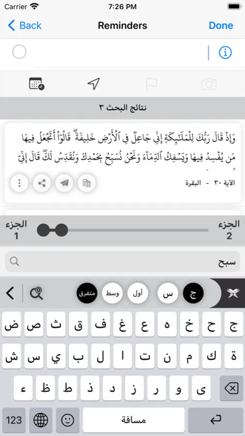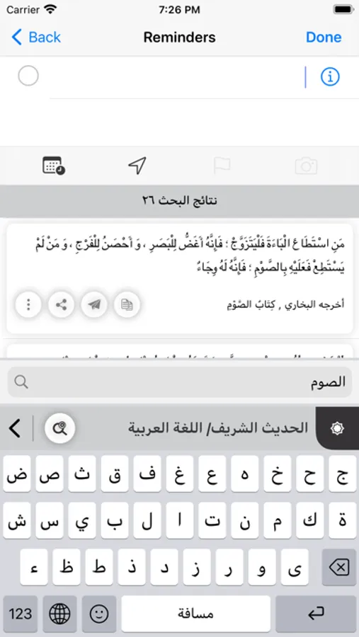 2- البحث في نصوص القرآن الكريم أو أحاديث الصحيحين وتسهيل استخدام النتيجة أو مشاركتها.