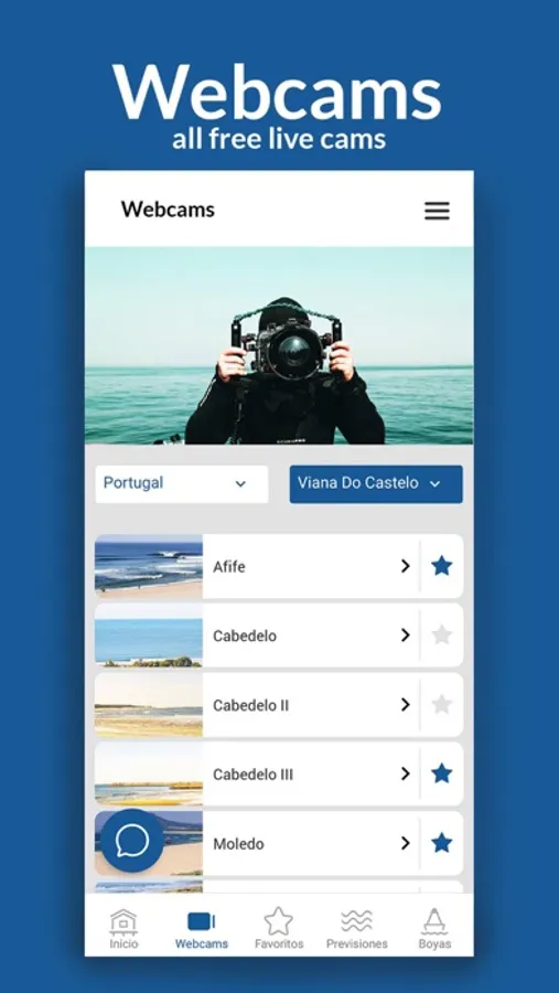 Acceso directo a favoritos, buscador de previsiones/webcams/boyas, las webcams más destacadas, noticias y recursos relacionados con el surf.