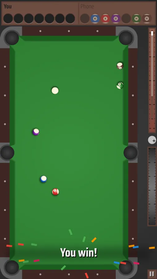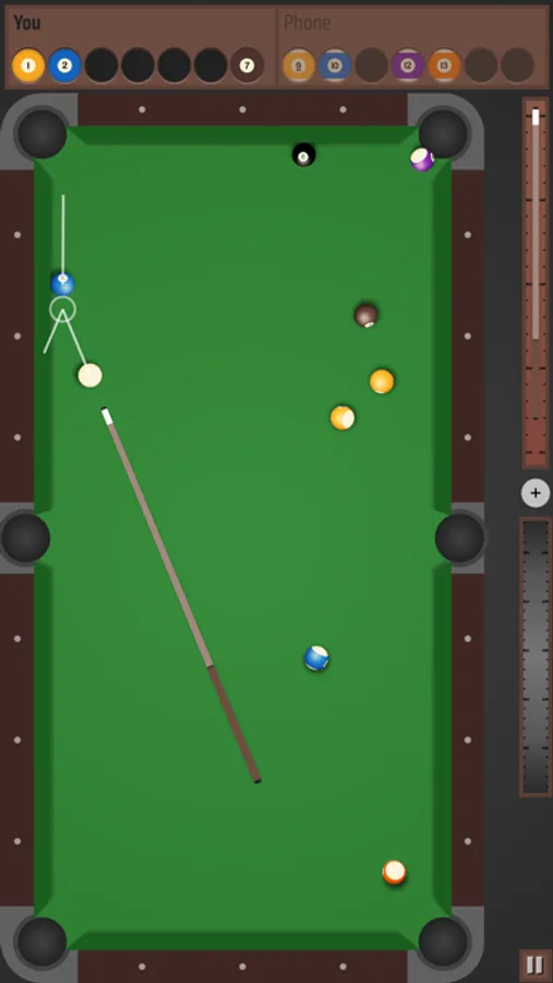 - "Play vs. Phone": Challenge your mind by playing against your own phone or tablet! Will you be able to beat the AI (Artificial Intelligence)? This is an ideal mode to practice your pool skills.