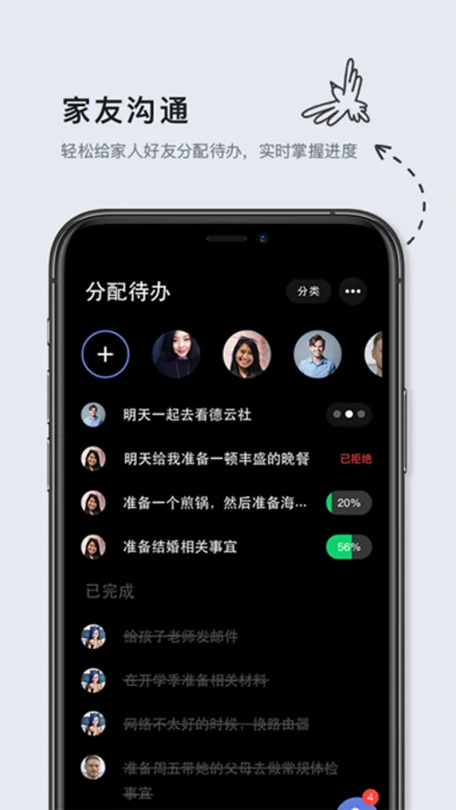 -添加好友,点击好友头像就给可以给他们快速添加待办,实时跟踪他们完成进度。