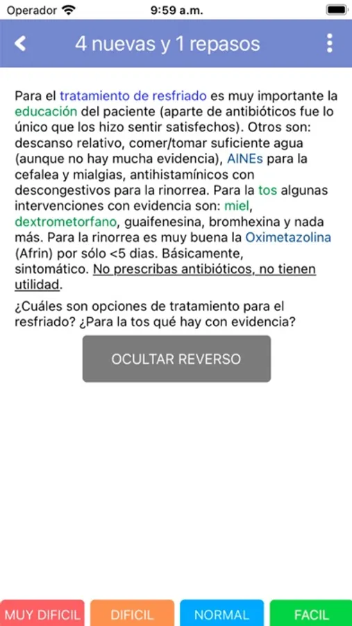 4) Repetición espaciada: Cuando lees algo, ¿cuánto recuerdas en 1 semana? ¿Y en 3 semanas? Aunque la memoria humana es increíble, estamos hechos para olvidar. Es ahí donde entra la Repetición Espaciada. Gracias al algoritmo, la aplicación va a agendar los repasos que tengas que hacer de los puntos clave, separándolos entre sí lo suficiente para que jamás los olvides. Así podrás recordar desde cosas tan esenciales como el tratamiento de la enterocolitis necrosante y la escala de Bell, hasta el cromosoma y gen que se muta en Fibrosis quística.