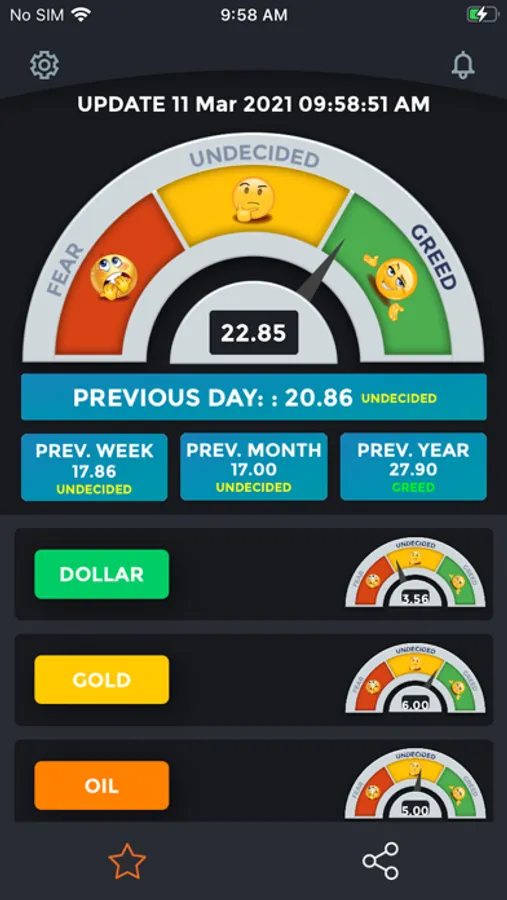 Fear and Greed relates to the volatility in the financial markets. This app takes into consideration all the performances of Currencies, commodities, Stocks and Bonds when determining the meter.