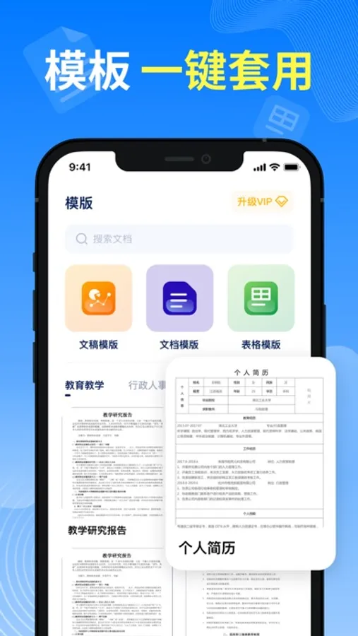手机办公文档同时提供了各行各类的不同模板素材以供使用。包括简历、合同、考勤、工资表、活动策划等,轻松制作出你需要的类型文档!