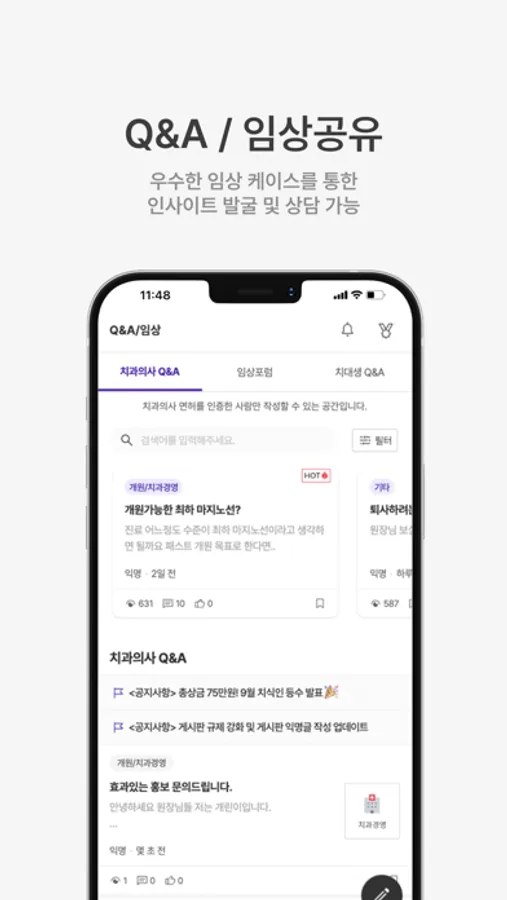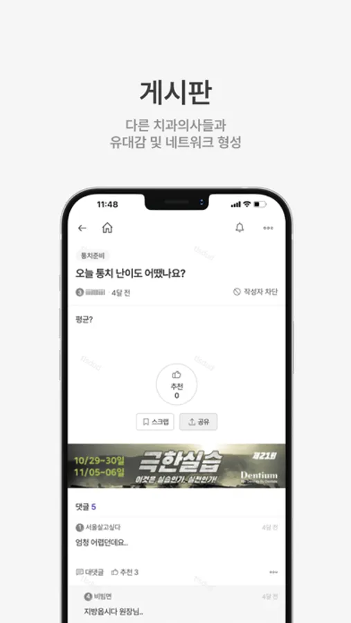 ◆ 게시판 | 동료 치과의사와 자유롭게 소통할 수 있습니다. 치과의사/전공의/군의관/여자치과의사 등 다양한 게시판에서 소통하며 네트워크를 형성하세요.