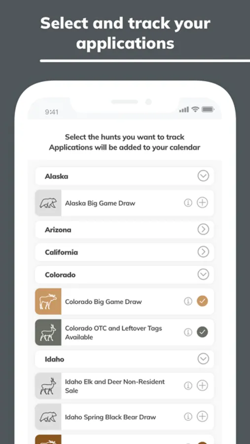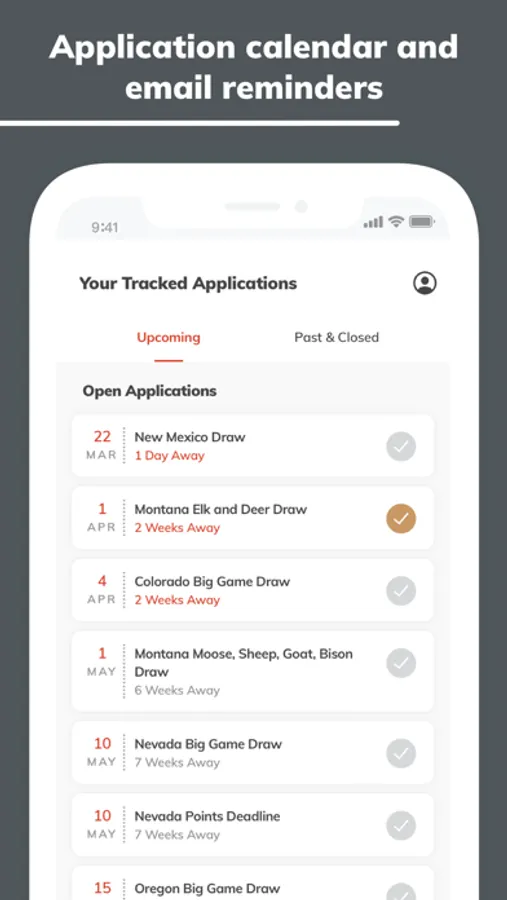 OnPoint is your ultimate hunting draw and application manager. Choose the applications you want to track, then OnPoint will create your personal hunt application calendar. We’ll send you reminders, keep track of your application status, and provide key details on each application, including species, point systems, residency requirements, and key dates.