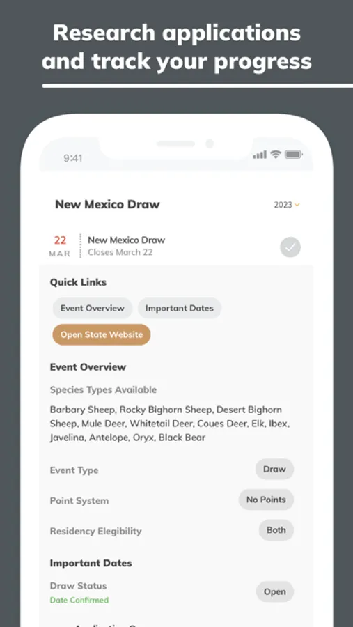 • Advanced details on each application, including points systems, species, key dates, and more.