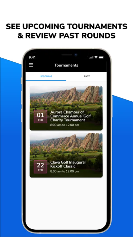 During play you can utilize Clava Golf to track scores, view leaderboards, get golf pro or course notifications, and see which team is in the hunt to win the tournament. When you're done playing, you can go back and review your upcoming and past tournaments to track progress or review your scores with friends. It's simple. It's easy. It's Clava Golf.