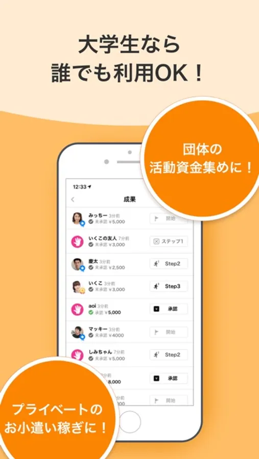 学生団体・サークル・体育会・部活・研究室ゼミなどの活動資金集めからプライベートのお小遣い稼ぎまで、大学生であれば誰でも利用でき、資金調達シーンにおいて幅広く活用できます。