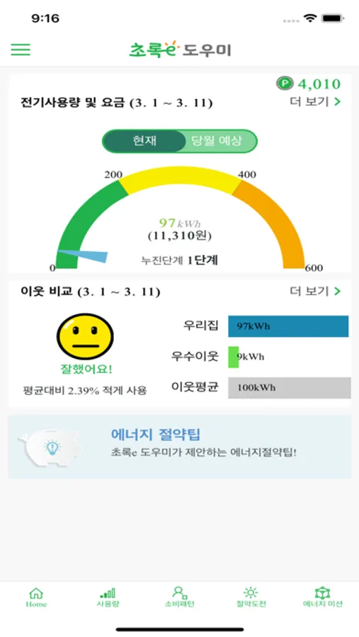 매주 한번 에너지 절감 알림을 받아 전기 사용을 줄이면 포인트를 적립할 수 있습니다. 적립한 포인트는 현금처럼 사용할 수 있습니다.