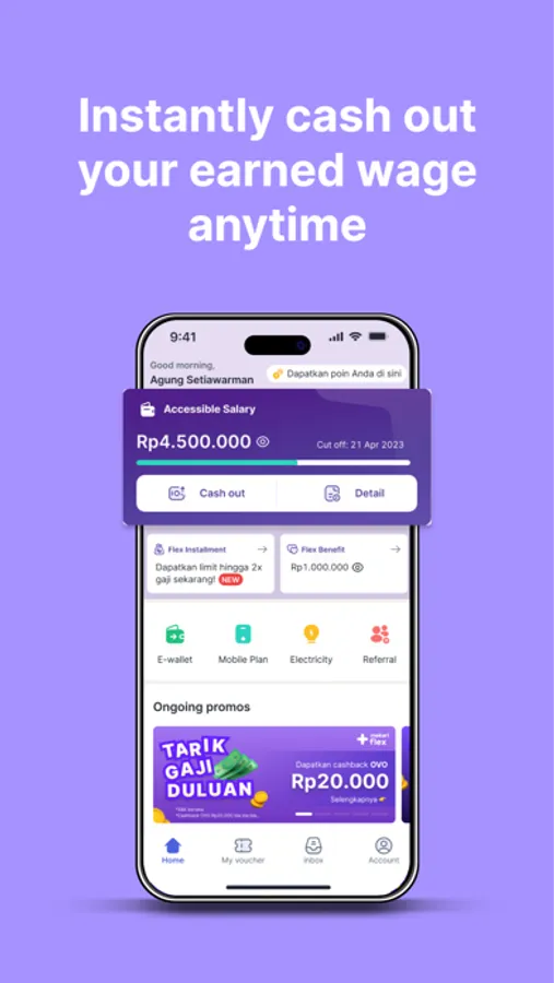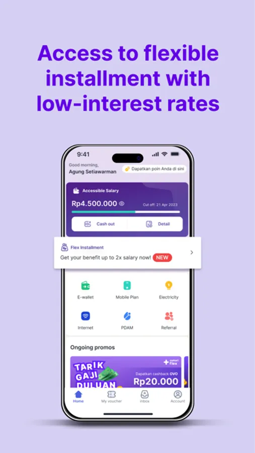 Flex Installment: enables employees to get funding up to 2x monthly wage with flexible & low-interest installments. This feature allows employees to fulfill bigger urgent expenses without disrupting their budget, whether it's a medical bill, educational expenses, or home repairs.