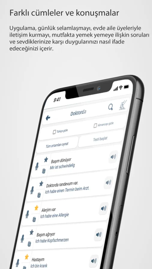 -Okuma, konuşma, dinleme ve yazma pratiği yapın. Uygulama aynı zamanda cümleyi Almanca konuşanlar tarafından yüksek sesle dinleme fırsatı sunuyor.
