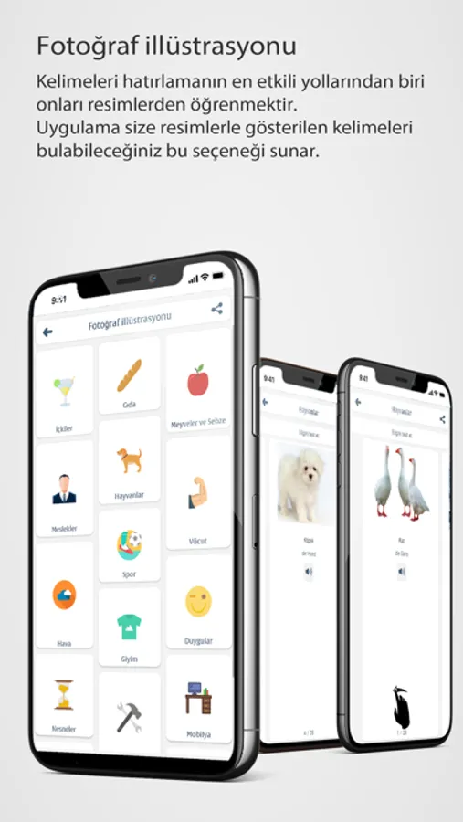 Kelimeleri hatırlamanın en etkili yollarından biri onları resimlerden öğrenmektir. Uygulama size resimlerle gösterilen kelimeleri bulabileceğiniz bu seçeneği sunar.