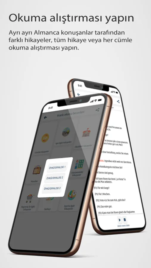 Ayrı ayrı Almanca konuşanlar tarafından farklı hikayeler, tüm hikaye veya her cümle okuma alıştırması yapın.