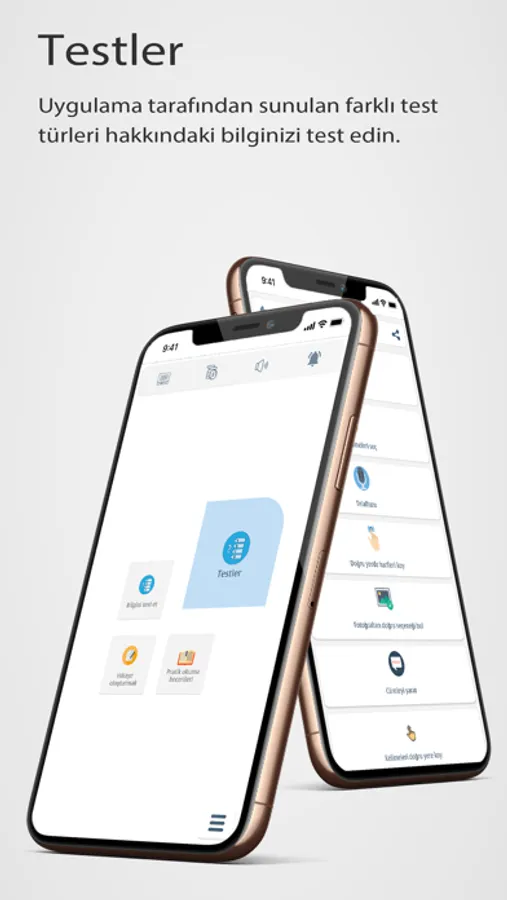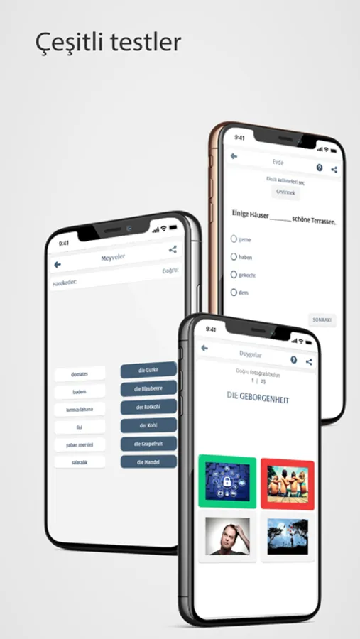 Uygulama tarafından sunulan farklı test türleri hakkındaki bilginizi test edin, örneğin: Örneğin, aynı anlamdaki kelimeleri birleştirmek, resimden doğru cevabı bulmak, kelimeyi veya cümleyi tercüme etmek, cümleyi dinlemek ve sonra yazmak, görünen cümleyi telaffuz etmek ve diğerleri.