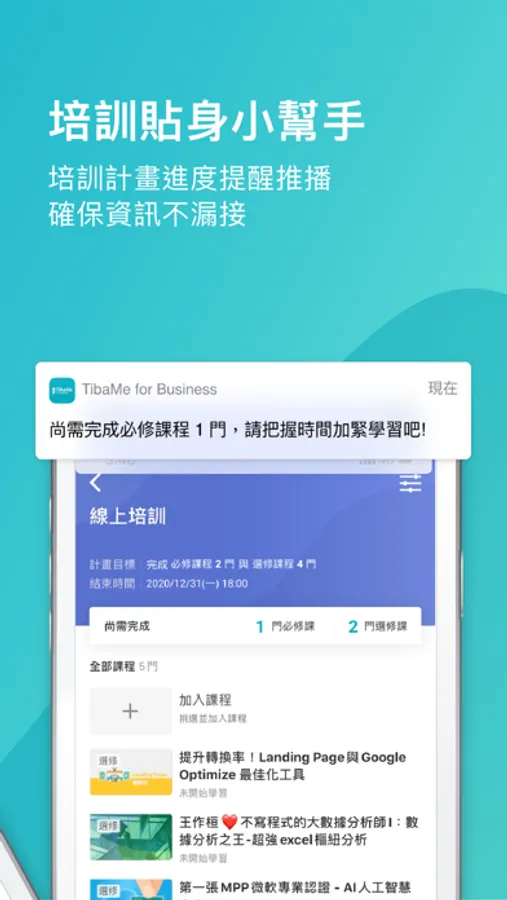 ▪ 培訓計畫學習推播 – 系統自動培訓進度推播,培訓貼身小幫手提醒你在計畫內完成學習。