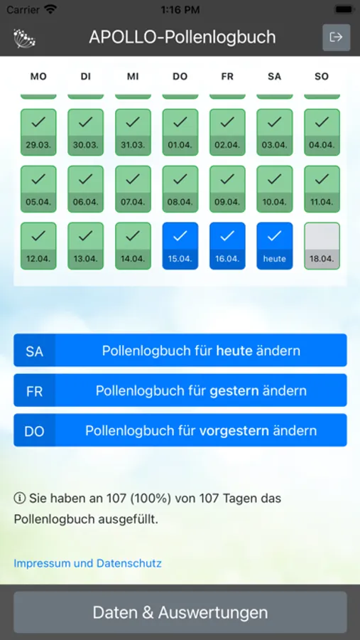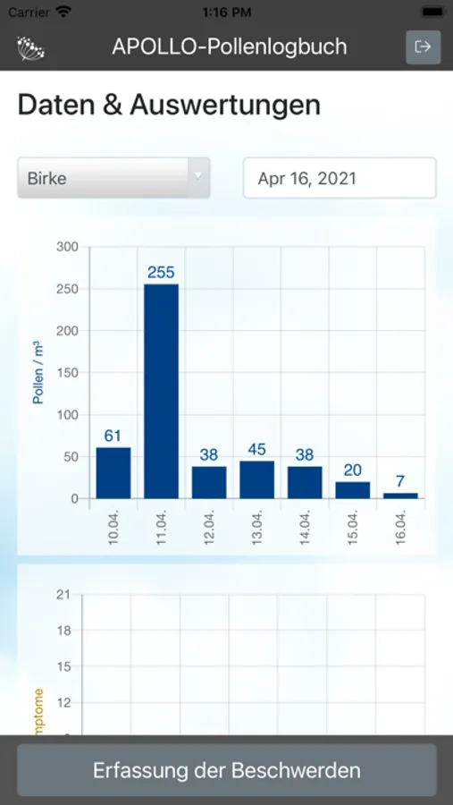 Das Pollenlogbuch ist ein Teil der APOLLO-Studie zum Gesundheitsmonitoring von Pollenallergikern/innen. Es ermöglicht den Studienteilnehmern/innen das tägliche Aufzeichnen von Symptomen und Beeinträchtigungen im Alltag, die durch ihre Pollenallergie hervorgerufen werden. Zusätzlich werden den Studienteilnehmern/innen Diagramme zur Pollenkonzentration in der Luft sowie eine graphische Darstellung ihrer Symptome und Beeinträchtigungen im Alltag im zeitlichen Verlauf zur Verfügung gestellt.
