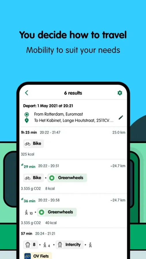 Make traveling even more personalized by entering your personal preferences. This allows you, for example, to choose the fastest route, the most sustainable, the healthiest (Kcal consumption) or based on price. Realtime traffic information and weather forecasts are also included in your travel advise. You can choose to travel with a single type of transport or 'multimodal' where, for example, you travel part of your journey by car or bicycle and part by public transport. Moves helps you to put together the most optimal mix of assets of transport!