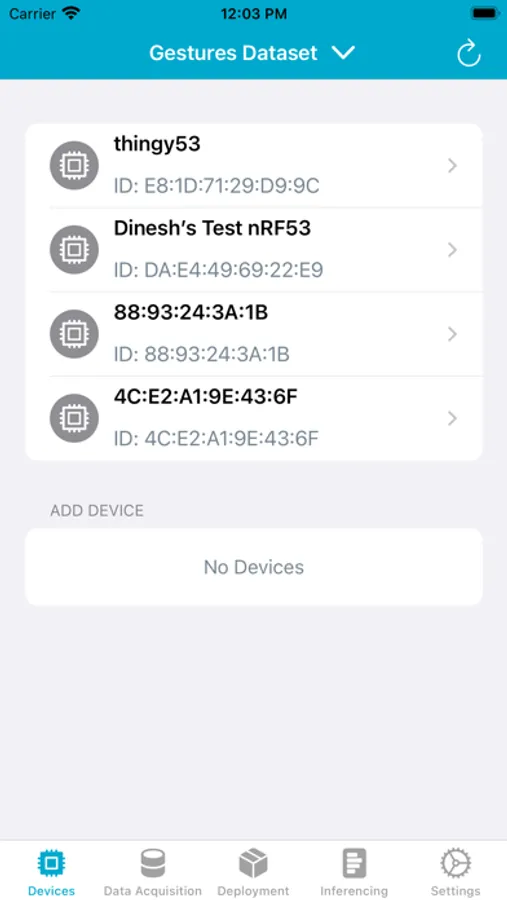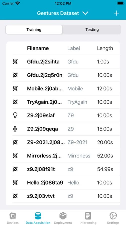 The collected sensor data can be labeled as training or testing data and may be inferenced directly in the app with machine learning model deployed to the Nordic Thingy:53.