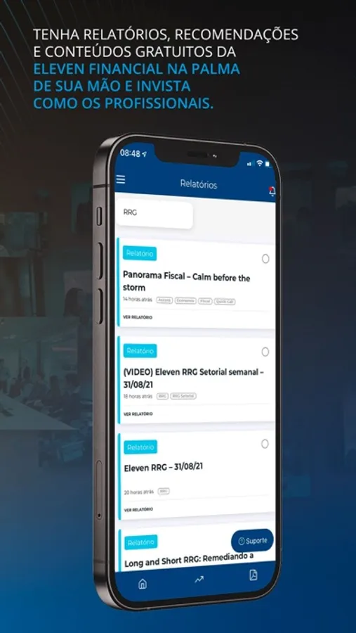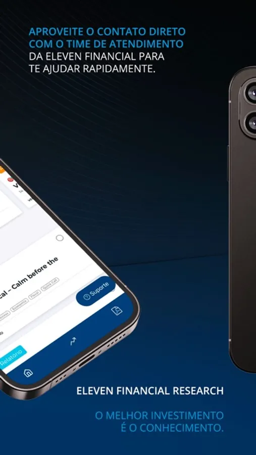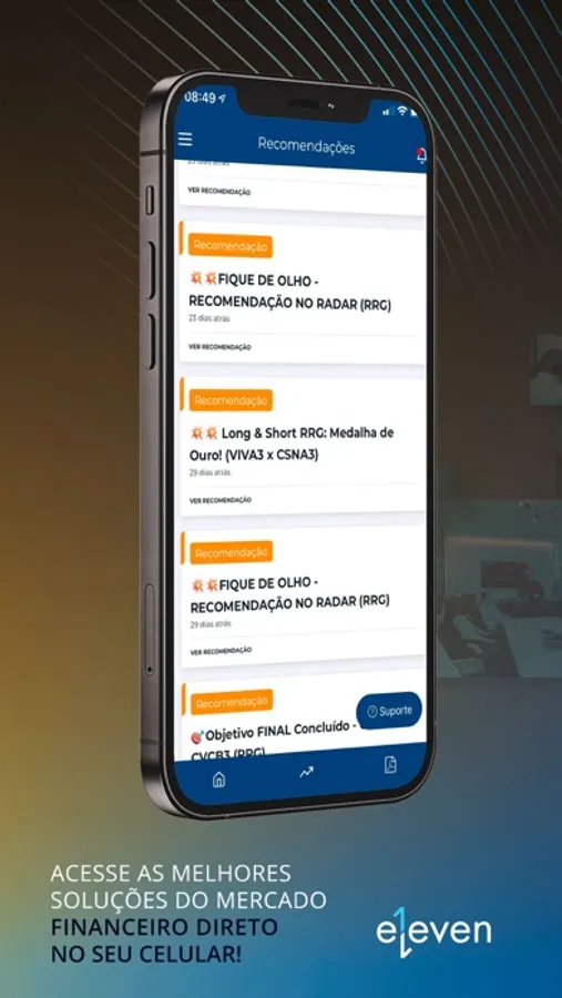 Aplicativo oficial da Eleven Financial vem com a finalidade de informar todos os produtos relacionados, além de notificar os clientes sobre novas recomendações de investimentos em tempo real da Eleven Financial. Além de receber o "push" de notificação de novas operações, também poderá consultar o histórico das recomendações.