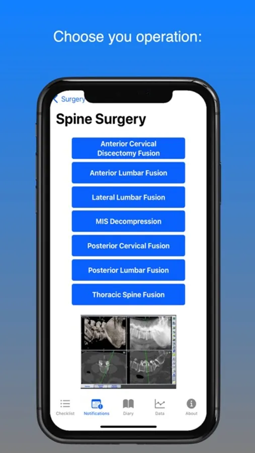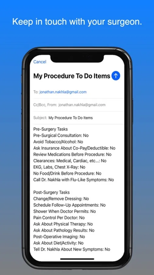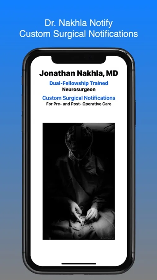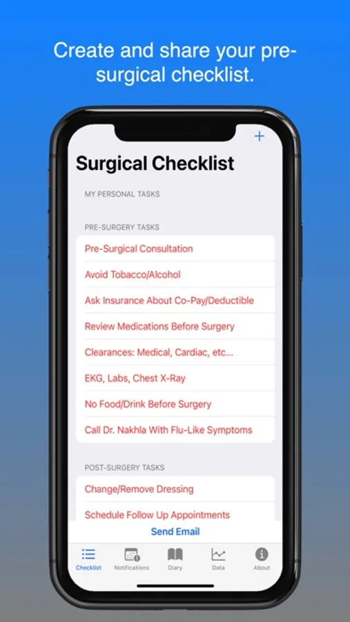 Novel custom surgical notifications to remind patients of their pre-operative and post-operative care. This app is designed to be surgeon specific as well as surgery specific. Patients easily put in the type of operation they are undergoing as well as the date. The app will take care of the rest. It will help make sure patients are reminded to get their all appropriate testing as well as not eat or drink the night before their operation. Furthermore, it reminds patients to remove dressings, shower, as well as schedule post-operative visits. Also, there is a checklist that users can populate as well as pre-populated items for pre- and post- operative care.