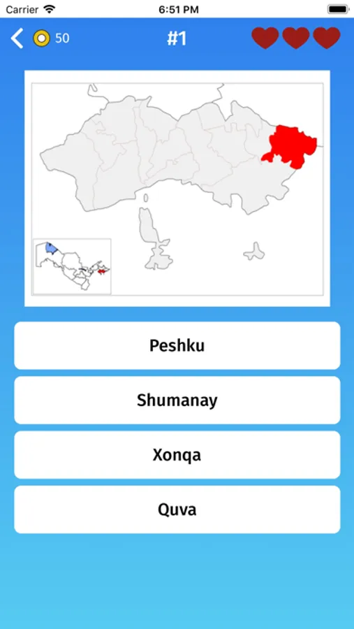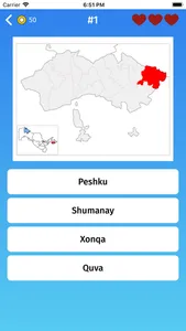 - Multiple choice: guess the provinces of Uzbekistan, by selecting one of the variants.