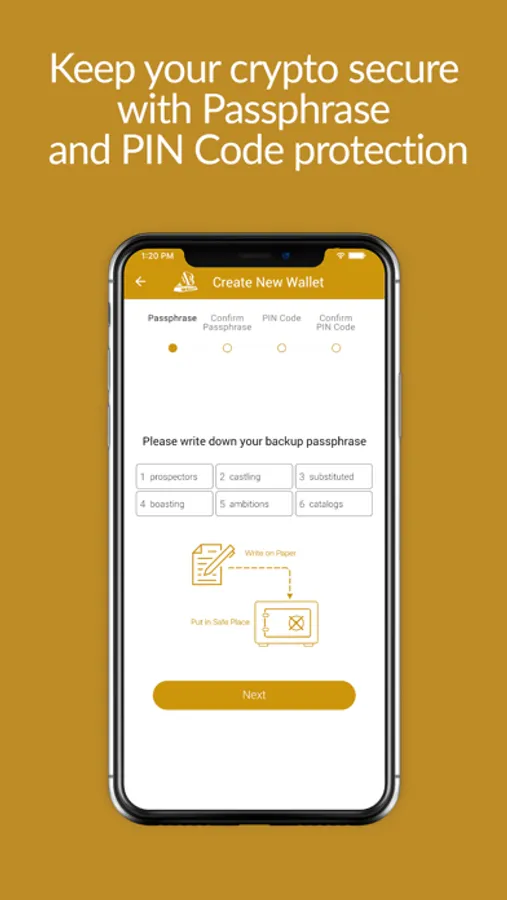 AABB Wallet is designed to protect you against thieves and hackers, while allowing you to manage your funds easily. Your digital assets are secured with the AABB Wallet. Backup 6-word passphrase and AABB Wallet asks for your PIN Code every time you open your cryptocurrency wallet and make transactions.
