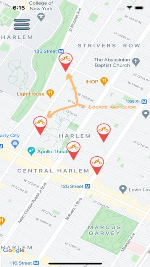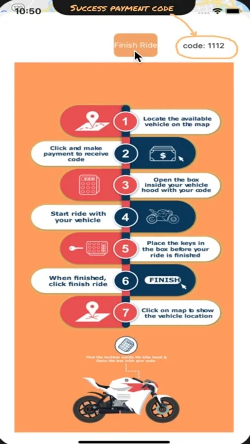 Locate electric bike with the geolocation feature enabled in the app. Click to pay on the bike you would like to rent. After successful payment, receive a code to start the bike. When you are done, click the finish button and show the location of the bike. You will billed for the entire ride.