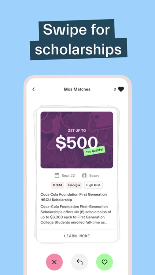 Take our quiz to find the scholarships you have the best chances of winning. Match with scholarships for your major, GPA, interests, and more--then swipe to save your favorites in the app.
