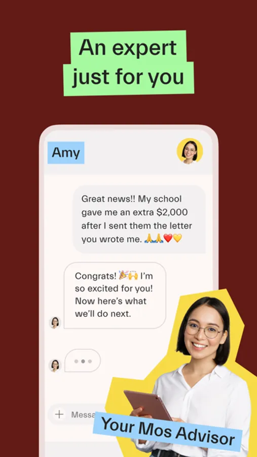 From FAFSA to filing appeals, you can do the financial aid stuff on your own. Want an expert to take over? That’s cool too--and where Mos financial aid advisors come in. Get unlimited access to an advisor who’ll review your annual aid offer, draft custom tuition negotiation letters, and more.*