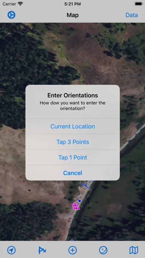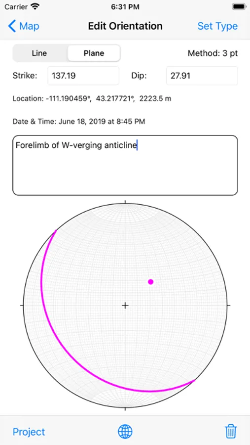 • Enter an orientation by any of five methods: (1) using the device orientation, (2) tapping three points on the map and having the device calculate the orientation, (3) sighting along the contact plane either in the strike or dip direction, (4) best fit plane to selected vertices on a path, or (5) type typing in the orientation at the location that you specify. You can project a contact temporarily as a check on the validity of the orientation; the projected contact can be converted to a regular contact.