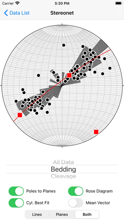 • Display orientation data on an equal area, lower hemisphere projection which can be filtered by data type. Mean vectors, cylindrical best fits, poles to planes, and rose diagrams can be displayed.