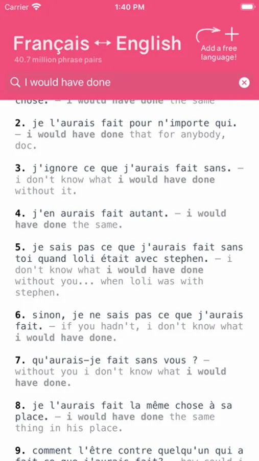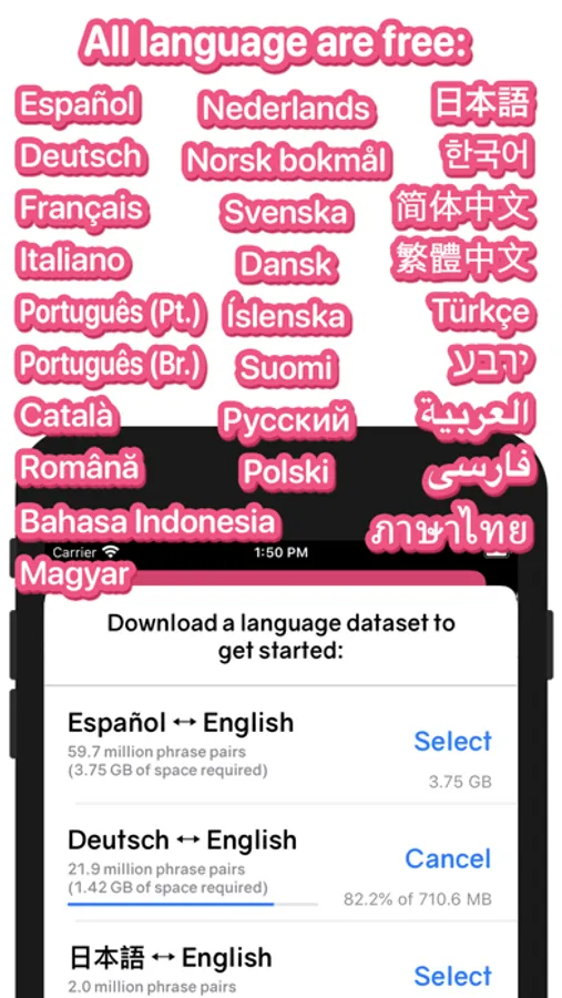 All languages are available to download for free! The app works by searching through paired movie subtitles in two different languages.