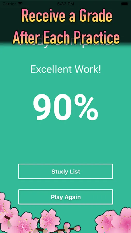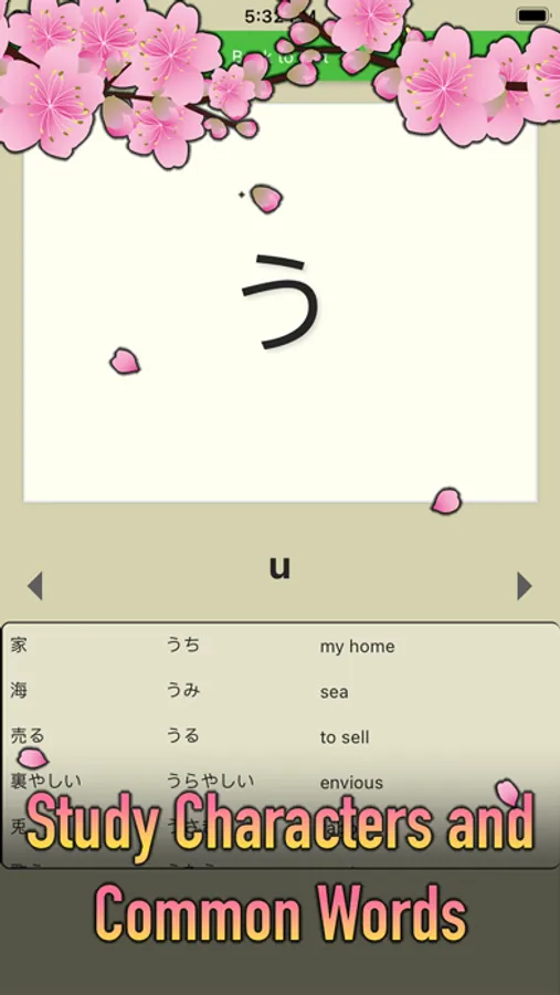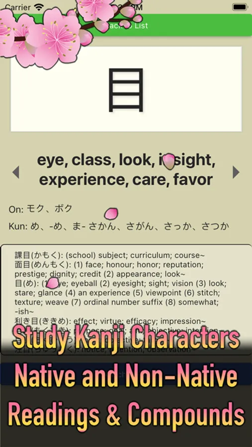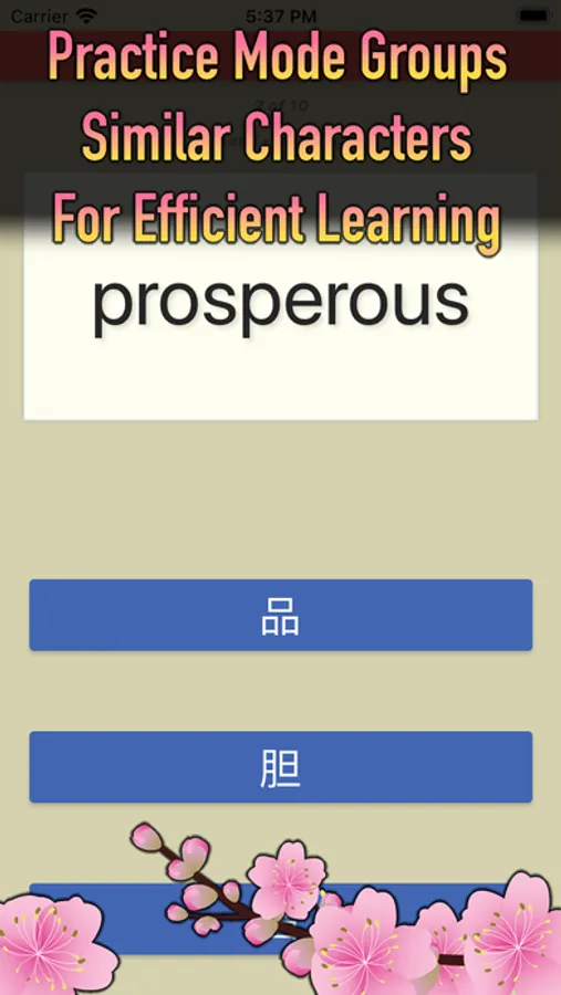 Use the built-in the flash-card practice when you're ready to test your knowledge. This flash-card practice gives you a multiple-choice selections to match the meaning to the character, but also chooses similar characters so you really learn the characters correctly.