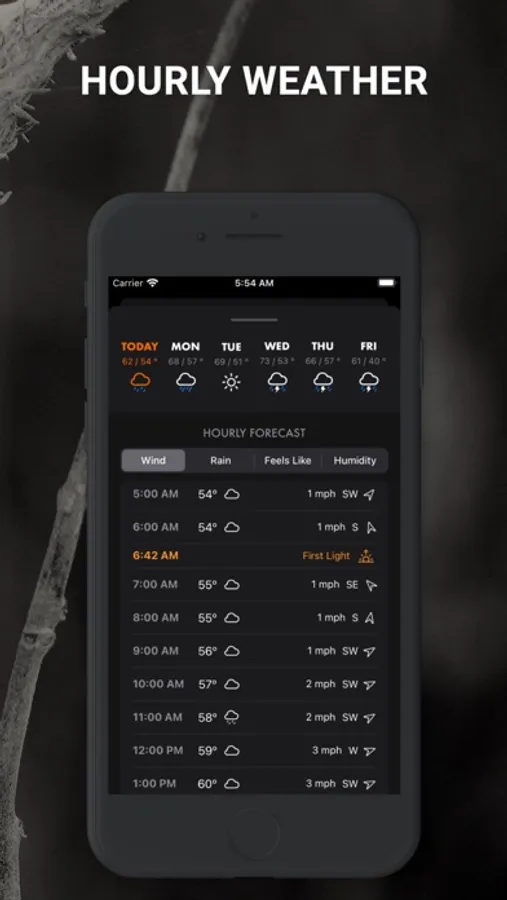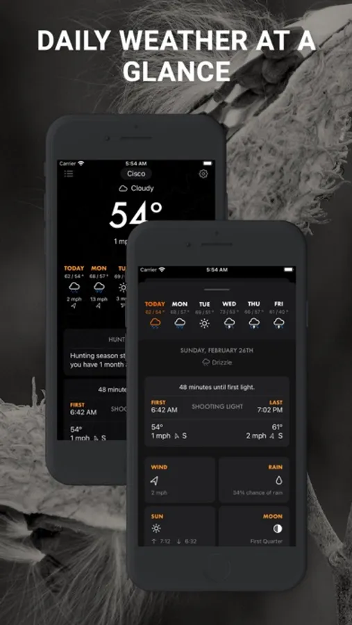 Our app Shooting Light started it all, and it's only fitting that we bring shooting light into our weather app, so we did. You can see when shooting light is and how much time is left until it starts or ends. You'll also see the temps around shooting light and any important weather details for your hunt's first and last hours.