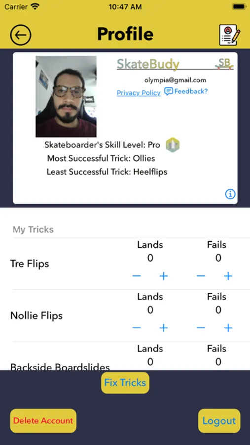 Download SkateBudy if your struggling to learn skateboarding tricks. We show desired skateboarding trick’s how-to video in app, and provide a place to save notes about that video or trick. After watching, and taking notes of the video you can input your attempts at the trick, and log the attempt as successful or failed to track your most successful trick. This will motivate you to keep attempting tricks! There is also a map that you can use to show your location for other skaters using SkateBudy can send you an e-mail.