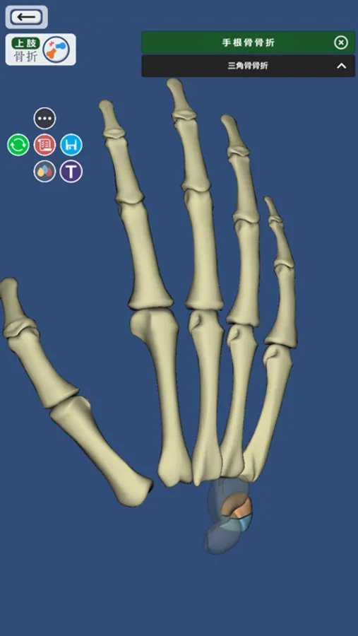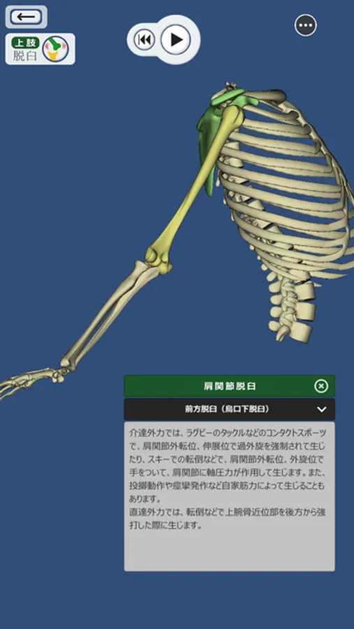 上肢、下肢の骨折と脱臼を3DCGのモデルとアニメーションで再現した骨折と脱臼を学ぶアプリ。