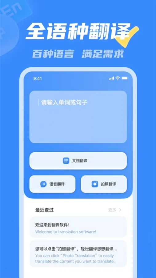【文本翻译】输入文字即可自动识别,提供多种语言翻译,并有例句辅助参考。