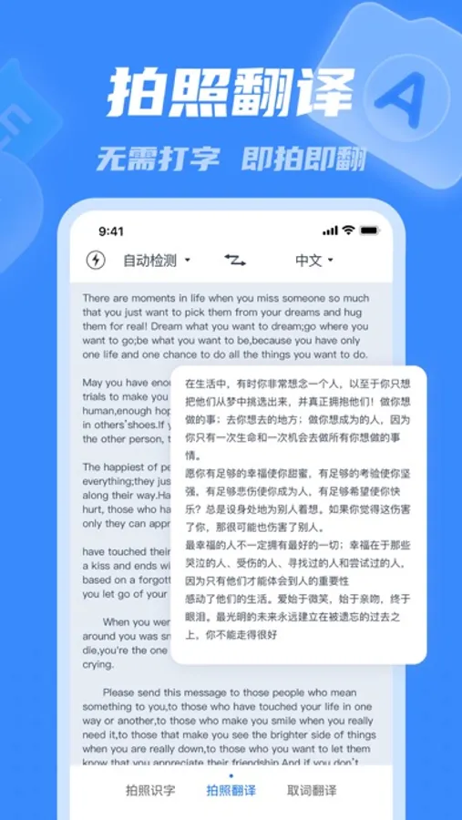 【拍照翻译】拍摄图片或者将相册中的图片上传,通过强大的识别技术一键翻译图片文字。