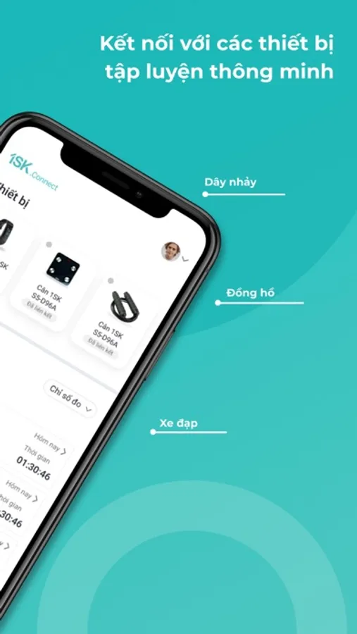 - Kết nối với các thiết bị tập luyện thông minh như dây nhảy thông minh 1SK, đồng hồ thông minh 1SK, xe đạp tập thông minh,...qua Bluetooth.