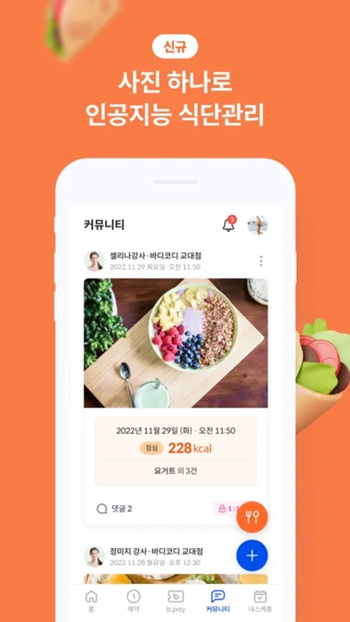 인공지능으로 스마트하게, 음식 사진만 찍으면 바로 칼로리가 자동분석되서 PT 강사님에게 전달되서 체계적인 다이어트, 식단 관리가 가능합니다.