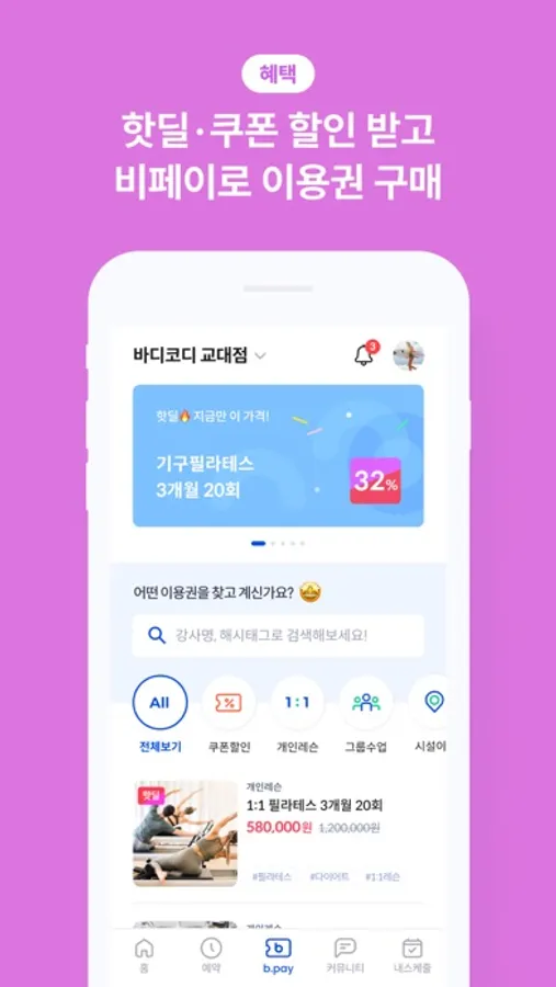 모바일 결제 비페이를 이용해서, 파격 할인 핫딜, 모바일 할인 쿠폰, 최대 12개월 무이자 할부혜택 등 저렴하게 피트니스 센터 이용권을 구매할 수 있습니다.