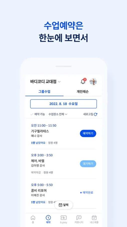 개인 PT, 그룹 수업을 실시간으로 예약하고, 바코드나 QR코드, 회원번호로 입장할 수 있는 모바일 회원증으로 쉽게 체크인하세요.