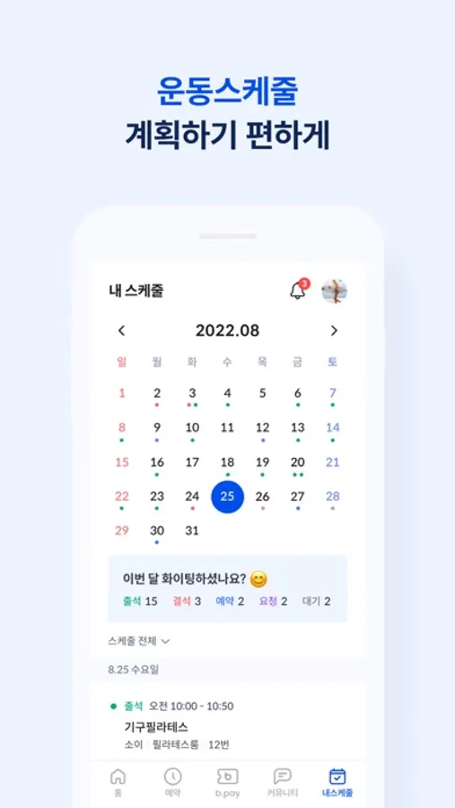 - 내 스케쥴에서 시설 이용 입장 기록 조회가 가능해 졌어요. 이번 달은 20일 이상 헬스장 출첵 어떠세요?
