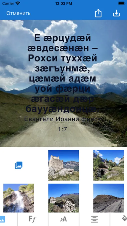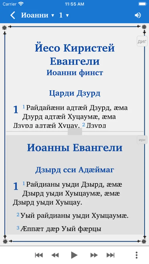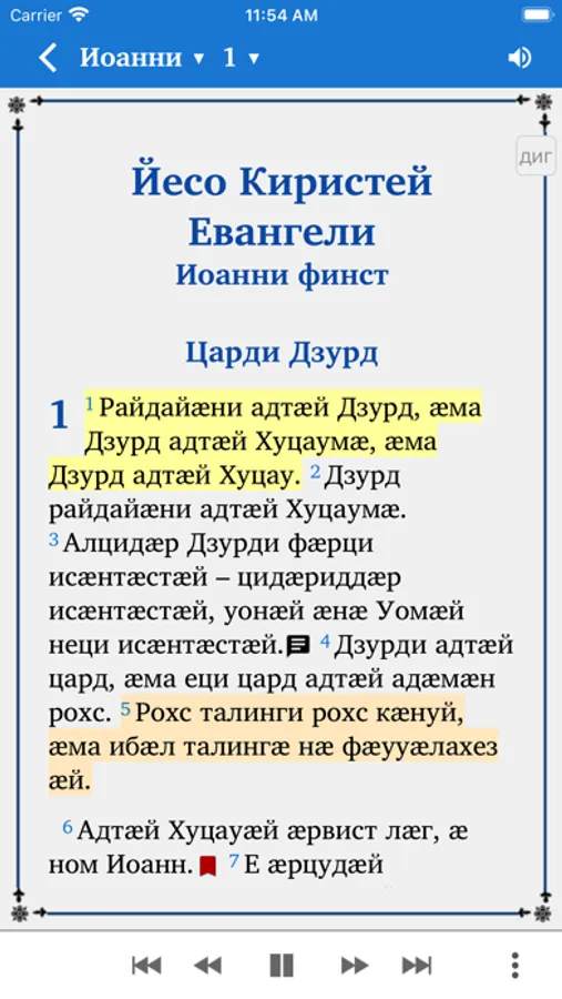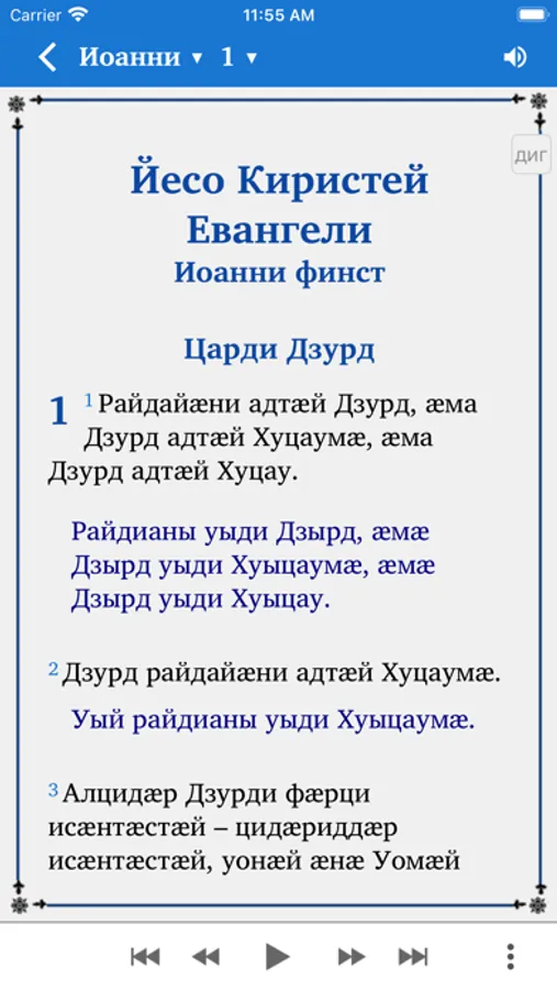 This Scripture app facilitates Bible study in the Digor language. The Ossetic translation (IBT, 2004) can optionally be added in parallel to the Digor text. Users can highlight verses in different colors, make bookmarks, write notes and view their reading history.