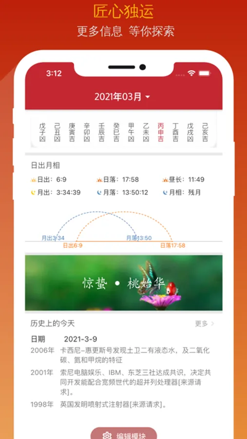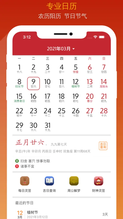 专业精品日历提供功能包括农历、日历假期查询,宜忌吉日查询,历史上的今天,灵签抽签,周公解梦、星座运势、八字运程、节日节气等功能,以及样式丰富的小组件。