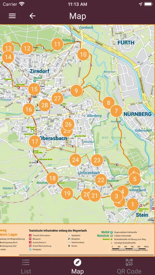 Eine Karte für den gesamten Rundweg zeigt alle Stationspunkte, an denen man durch das Scannen des QR-Codes neue Inhalte in der App aktivieren kann.